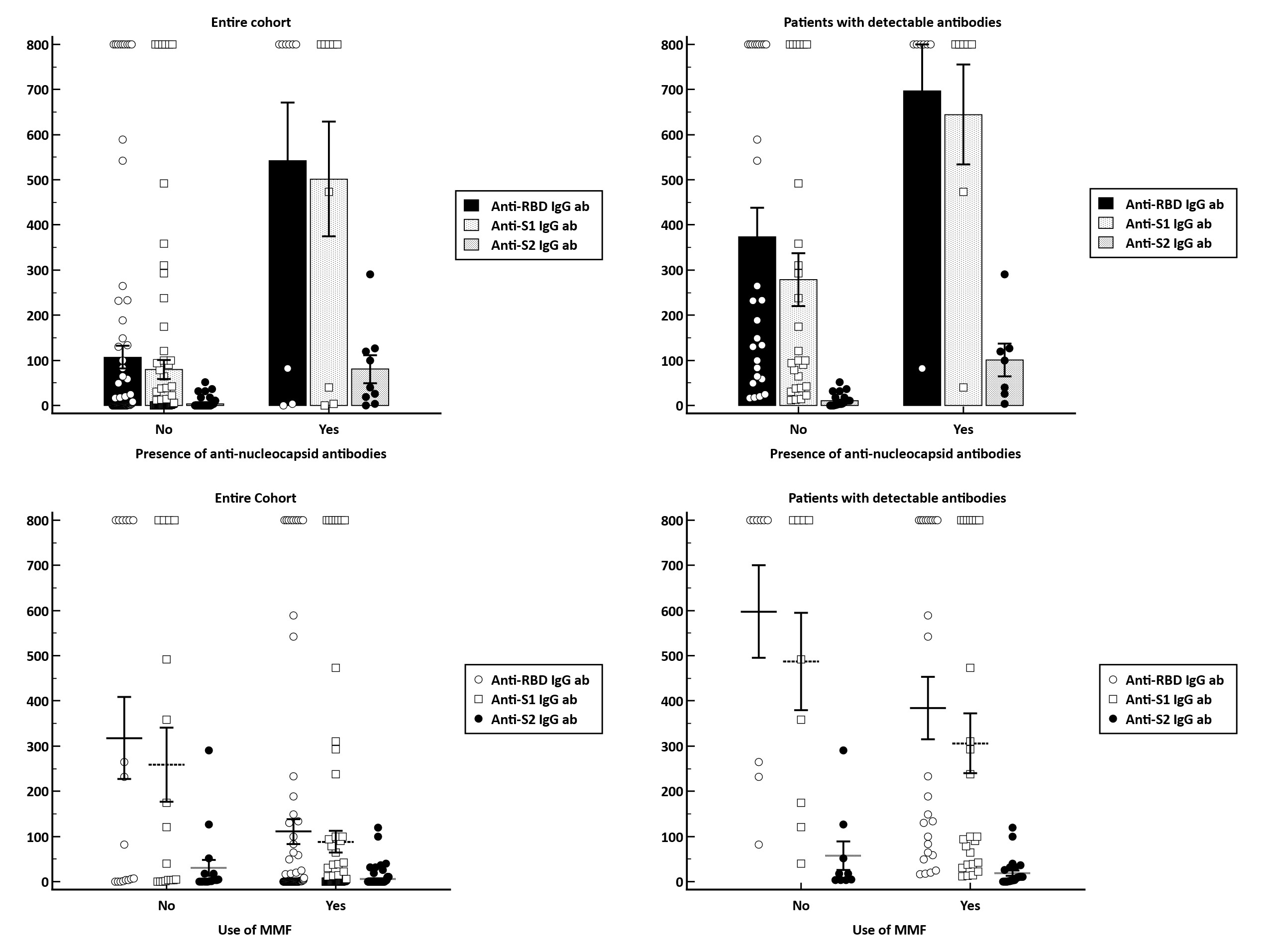 Results: The study cohort enrolled 104 KT recipients that underwent assessment of serological responses at a median 3 weeks (IQR: 1.6-4.9) after vaccination. The majority of patients received either the BNT162b2 (50%) or mRNA-1273 (47.1%), with only 2.9% of patients receiving the Ad26.COV2.S vaccine. Overall, 32.7% of patients became seropositive with a median anti-S1 IgG and anti-RBD IgG levels of 403 BAU/ml (IQR:82-800) and 206 BAU/ml (IQR:41-800). In terms of predictive factors for vaccine response, we identified that those on an immunosuppressive regimen containing MMF were less likely to develop a seroconversion (relative risk [RR], 0.54 [95% CI, 0.31-0.94]; p=0.03). By contrast, patients with evidence of previous infection as documented by anti-nucleocapsid positivity were significantly more likely to became seropositive (RR, 2.73; 95%CI, 1.7-4.39; p<0.001). Regarding the temporal evolution of humoral response, there is a clear tendency for a weaning of antibody response over time. In patients with a vaccine response, the median titer of anti-RBD antibodies decreased from 800 BAU/ml (IQR:257-800), in patients with serum samples within 2 weeks after vaccination, to 168 BAU/ml (IQR:74-641), in patients with samples taken after more than 4 weeks post-vaccination (p=0.15). Similarly, the anti-S1 IgG antibody titers were higher in patients with serum samples taken early after vaccination [636 BAU/ml (IQR:276-800), for 0-2 weeks; 579 BAU/ml (IQR:39-800), for 2-4 weeks and 97 BAU/ml (IQR:37-251) for > 4 weeks; p=0.05]. In multivariate logistic regression analysis, we identified the presence of anti-nucleocapsid IgG antibodies as being independently associated with approximately 8-fold higher chance for a seroconversion (HR, 7.96; 95%CI, 1.26-50.1), while use of MMF-containing immunosuppressive regimens decreased the chance of humoral response by approximately 66% (HR, 0.34; 95%CI, 0.1-1.11).