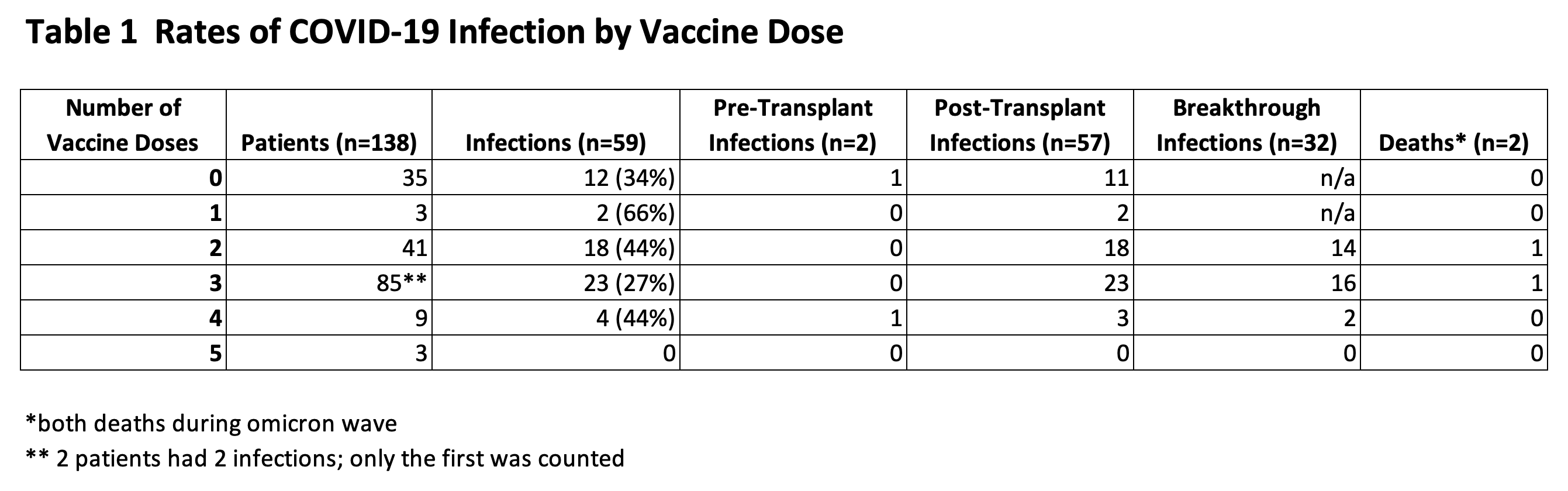 Results and Discussion: The mean age at transplant was 45.3+/-9.1 years, and the mean current BMI 27.9+/-5.6. There were 95 (53%) males, 90 (50.3%) were white, 68 (38%) black, 8 (4.5%) Asian, and 10 (5.6%) others. The majority were SPK recipients (140, 78%). During a mean of 1228+/-687 days of follow-up, there were 12 organ failures (8 P, 2 K, 2 SPK). Of patients who developed a COVID infection, only 2 (3%) patients died (with functioning grafts) from COVID infection. Both were fully vaccinated with 2 and 3 doses, respectively. A third patient died from unrelated causes. 138/176 (78%) PTR were fully vaccinated (>=2 doses of mRNA vaccine), 35 patients remain unvaccinated; 3 had only one dose of vaccine. Among the unvaccinated or partially vaccinated group, 13/38 (34%) patients developed COVID-19 infection. In vaccinated patients, 44/138 (32%) patients developed infections, at a mean of 160+/-94 days after the most recent vaccine dose prior to the infection, or 216+/-75 days after being fully vaccinated. Table 1 shows the distribution of infections by number of vaccines. Among post-transplant infections, 11 occurred during the ancestral wave; 7 during the alpha/beta/gamma wave (December 2020-May 2021), 7 during the delta wave (May 2021-December 2021), and 32 occurred during the omicron wave (December 2021-now).