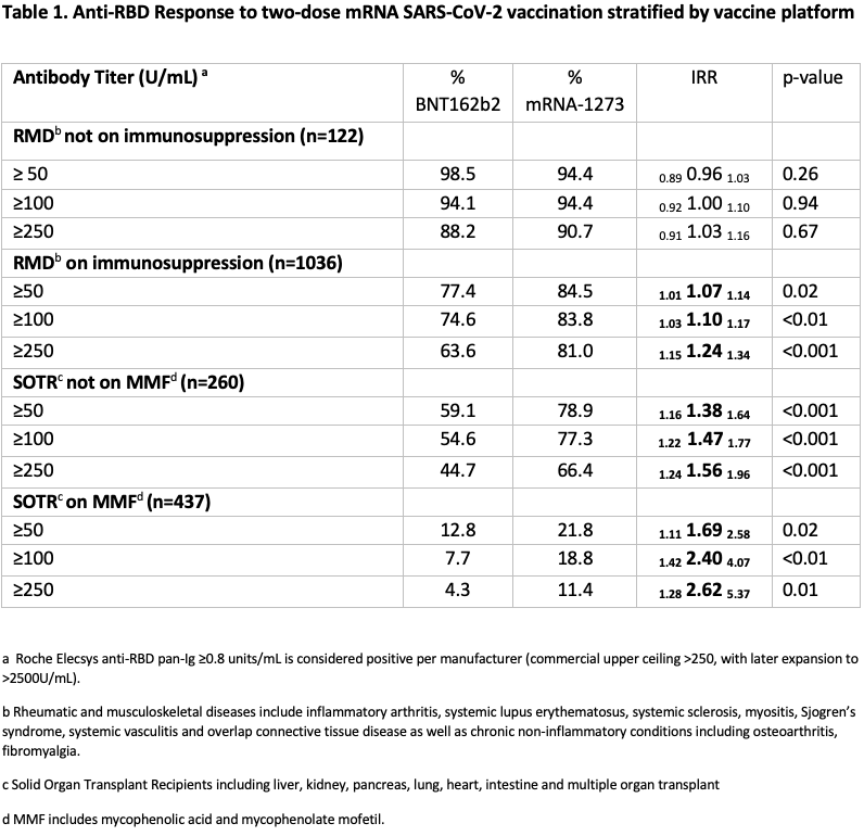 Results: Of 1868 participants, 55.8% of RMD and 52.7% of SOTRs received BNT162b2; the remainder received mRNA-1273. Demographics, diagnoses, and immunosuppressive regimens were similar across vaccine groups. Among RMD participants not on immunosuppression, the chance of anti-RBD ≥250U/ml was comparable among BNT162b2 and mRNA-1273 recipients (IRR= 0.91 1.03 1.16 p= 0.67). mRNA-1273 recipients had a higher chance than BNT162b2 recipients to achieve anti-RBD ≥250U/ml among RMD participants on immunosuppression (IRR = 1.15 1.24 1.34, p<0.001); SOTRs not on MMF (IRR = 1.24 1.56 1.96, p <0.001); and SOTRs on MMF (IRR= 1.28 2.62 5.37, p= 0.01). Similar trends were observed with titer cutoffs of ≥100 and ≥50 U/mL (Table 1).