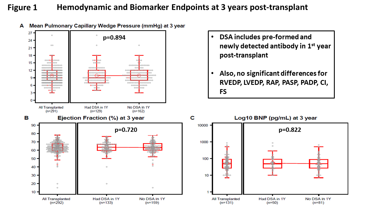Methods: Consecutive children listed for Tx at 9 North American centers were prospectively enrolled. Management of sensitization, immunosuppression and rejection surveillance were standardized. The primary endpoint was pulmonary capillary wedge pressure (PCWP) at 3 years post-PHTx. Secondary endpoints included other hemodynamics measures, ejection fraction (EF), brain natriuretic peptide (BNP), graft and patient survival and rejection. DSA was defined as single antigen Luminex testing as ≥1 antibody specific to donor HLA antigens with MFI>1000 (based on core laboratory).