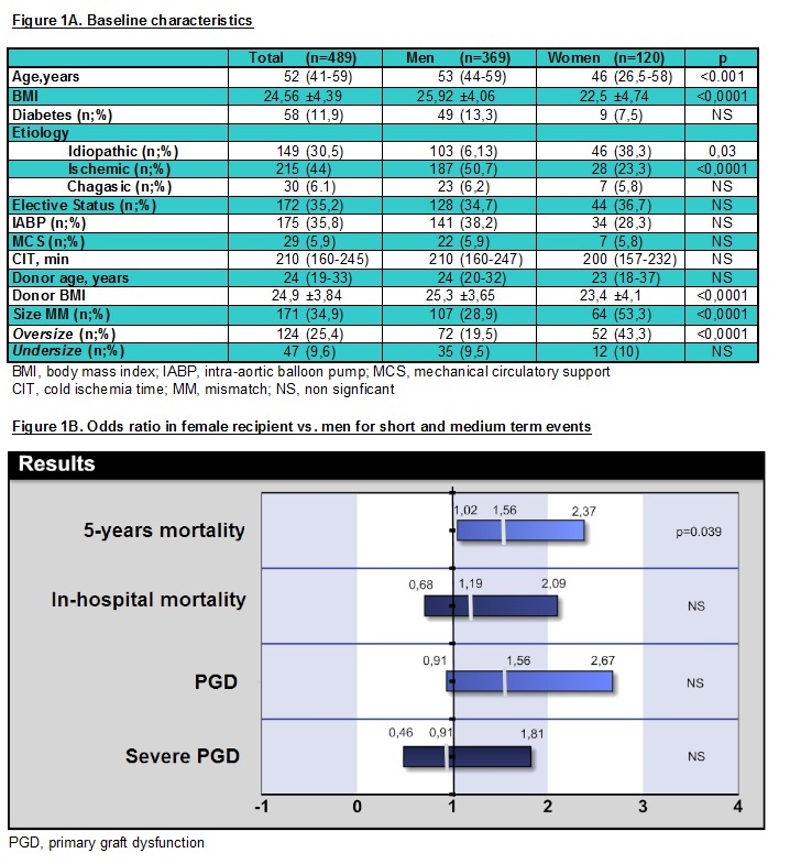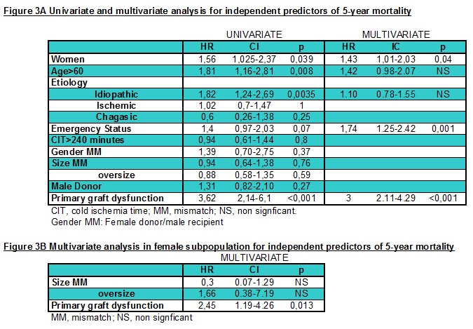 Results: Overall, 489 patients were included, 369 men (75.5%) and 120 women (24.5%). The characteristics of the population are shown in Figure 1A. The median age was 52 years (IQR 41-59), with the women being younger and with a lower body mass index (BMI). Regarding the etiology, idiopathic cardiomyopathy was more frequent in women and ischemic cardiomyopathy in men. There were no differences in elective status, level of hemodynamic support, or pre-transplant ischemia times. Although the women received donors with lower BMI, the size mismatch was greater in this group at the expense of greater oversize. The incidence of primary graft dysfunction (PGD), severe PGD, and in-hospital mortality was similar between men and women, however, female recipients had higher 5-year mortality (34.4% vs. 45% OR 1.56; CI 1.03 -2.37; p=0.039), without differences in the causes of death (Figures 1B and 2). In the multivariate analysis, female recipient, PGD and emergency condition were independent predictors of 5-year mortality. When analyzing the subgroup of female recipients, PGD and size mismatch at the expense of oversize were associated with higher mortality, however, in the multivariate analysis, only PGD maintained statistical significance. (HR 2.45, CI 1.19-4.26, p= 0.013) (Figure 3)