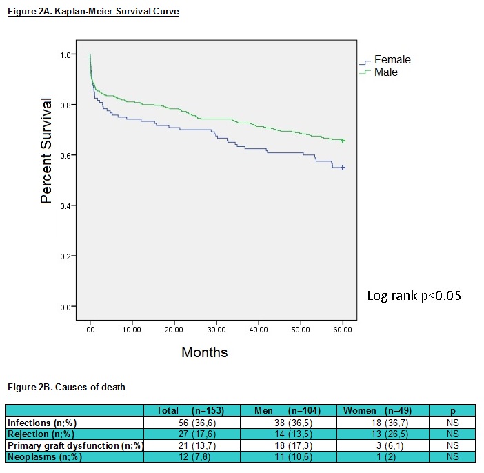 Conclusion: Female heart transplant recipients have a worse prognosis in the medium term with higher mortality at 5 years, without differences in hospital mortality. Larger studies are required to elucidate the underlying mechanisms with their potential therapeutic implications.